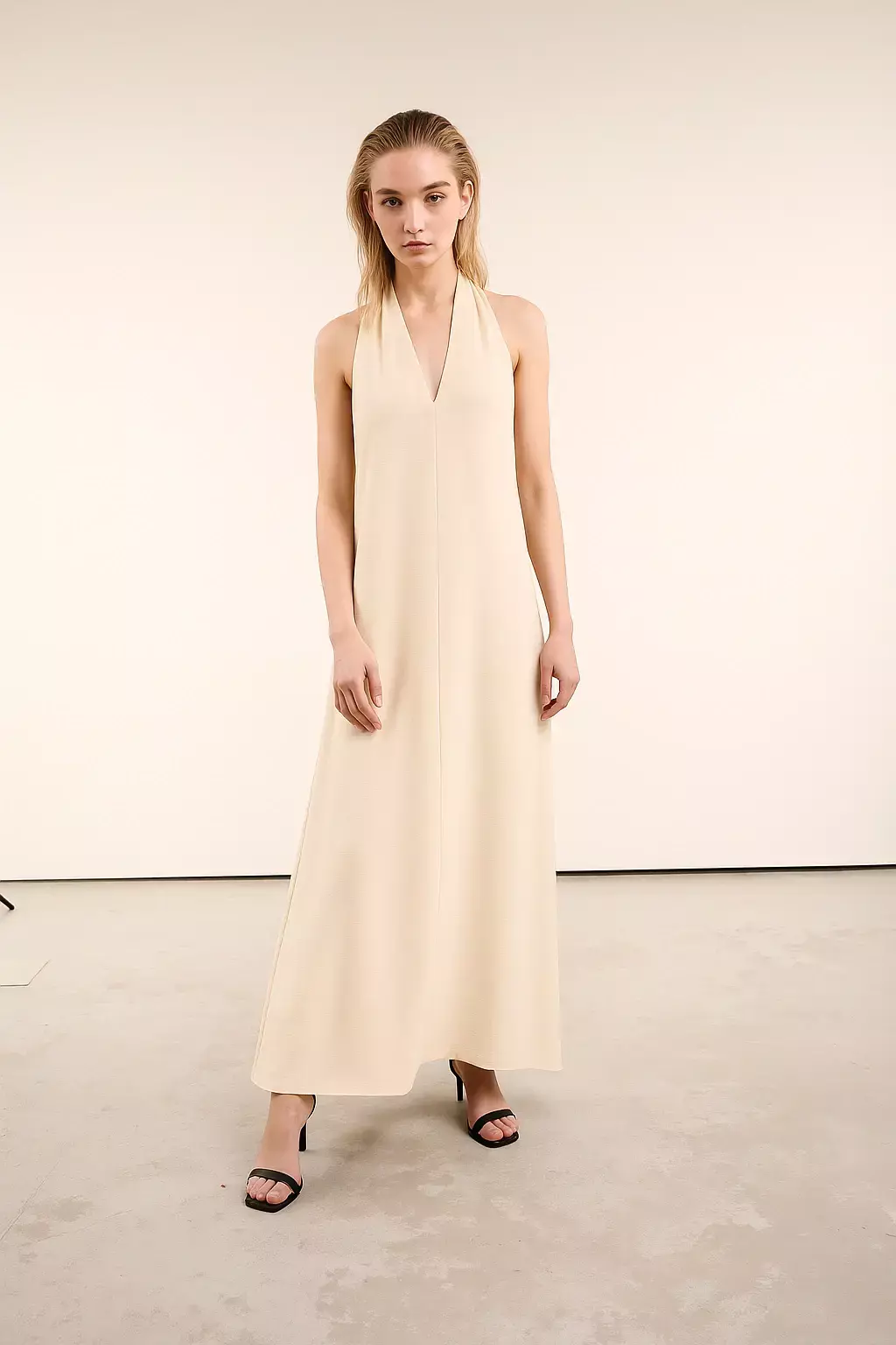 VESTIDO LARGO CON ESCOTE PROFUNDO Y SILUETA AMPLIA. IMPACTANTE, MINIMALISTA Y ELEGANTE.